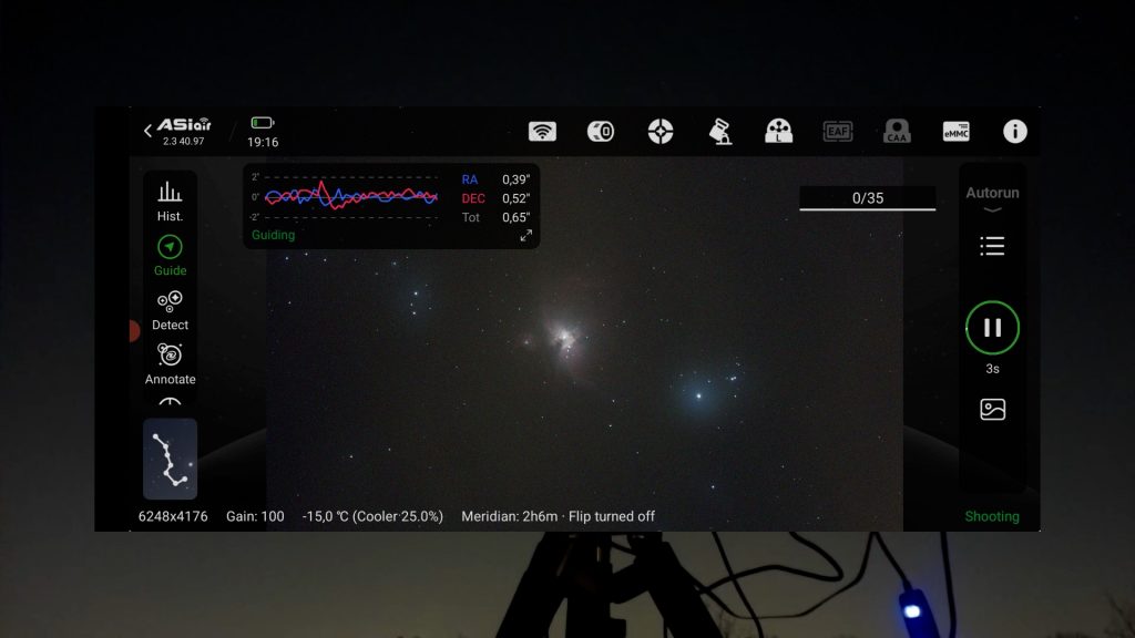 The biggest benefit of the ASI2600MC AIR is integration. Because the guide sensor and the ASIAIR computer are built in, you immediately lose two cables: no USB from the main camera to a standalone ASIAIR, and no USB cable for an external guide camera. The rig is cleaner and lighter, and meridian flips are less stressful because there’s less chance of cable snags. We already covered the guide-sensor pros and cons in the Duo section; so let’s discuss the pros and cons of having an “ASIAIR inside” the camera.