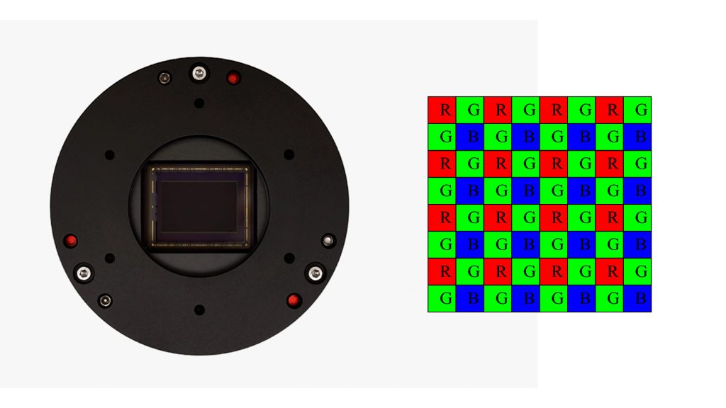 But here’s the catch: the color version is less efficient at capturing specific colors because of its Bayer matrix. Half the pixels are covered with green filters, a quarter with red, and a quarter with blue. This is a so-called RGGB pattern. That means when red light from an emission nebula hits the sensor, only the red-filtered pixels record it, while the rest block it. The same goes for blue light, which is only recorded when it passes through a blue filter. So with a color camera, only 25% of the pixels capture red, and only 25% capture blue—half capture green. That’s fine for natural color images, but it means you’re less efficient at recording the red and blue light that many nebulae, like the Orion Nebula or the North America Nebula, glow in.