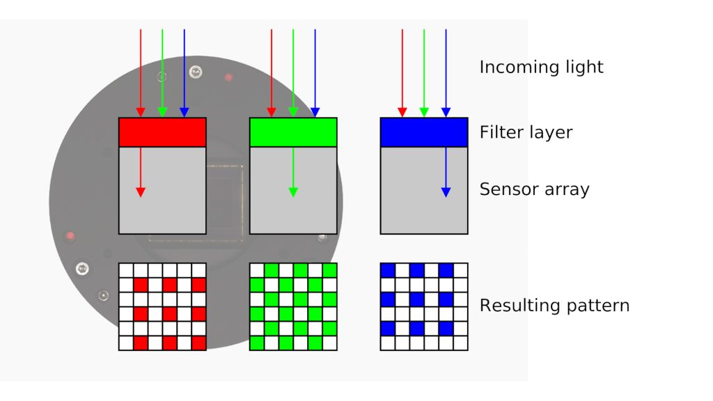 - Less efficient due to Bayer matrix (red/blue capture limited)